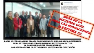 Este acto (la creación de esta entidad), es claramente una afrenta a las personas que han trabajado honestamente, con compromiso, con responsabilidad social en la creación de la Mesa de la Sociedad Civil de Colombianos en el Exterior, junto a la Cancillería. Un acto de mala fe, que nosotros como Sociedad Civil, no podemos permitir.