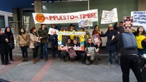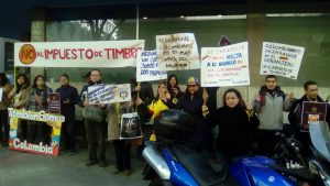 Desde los primeros días del mes de enero, un grupo de colombianos en la ciudad de Madrid – España, pertenecientes a la “Mesa Migraciones Madrid”, con la participación de “COLEXRET”, al ser conocedores que el Gobierno de nuestro país elevaba nuevamente el Impuesto de Timbre Nacional en los trámites que se realizan ante los Consulados, quedando asi en un 40% sobre el costo de estos, decidieron emprender una campaña popular, a fin de que nuestros compatriotas residentes fuera del país, manifestaran su inconformismo ante esta nueva injusticia, a través de manifestaciones pacíficas frente a los Consulados colombianos en el mundo.