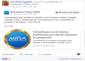 El Grupo político MIRA, con la cabeza visible de la Representante por los colombianos en el exterior Ana Paola Agudelo García, no solo se estaba atribuyendo la iniciativa, organización y desarrollo de una idea craneada por ciudadanos del común, sin ninguna afinidad política, luchadores por un bien común, sin intereses de ninguna índole; sino que recogía firmas de ciudadanos haciendo publicidad a ese partido en las planillas destinadas para tal fin.