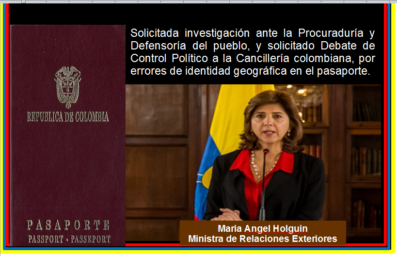 Como lo informamos en nuestra editorial del pasado 26 de Febrero (Ver aquí), y por considerar que con esa acción se está vulnerando la identidad geográfica de nuestro país, “COLEXRET” ha procedido a solicitar en el día de hoy a la Procuraduría General de la Nación, y a la Defensoría del Pueblo, iniciar las respectivas investigaciones para determinar los responsables de ese error o irregularidad que tiene actualmente a los colombianos identificándose en el exterior con un pasaporte en el que no se ha plasmado toda nuestra geografía, puesto que omitieron incluir en el mapa colombiano, las Islas de San Andrés, Providencia, Santa Catalina, y otras.