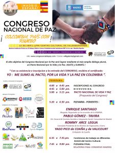 Igualmente nos informa el “Comité por la Paz de Colombia en Madrid” que en el marco de ese Congreso Nacional de Paz, se elaboró un manifiesto que puede ser firmado por organizaciones y/o ciudadanos del mundo, en el siguiente link: https://docs.google.com/forms/d/e/1FAIpQLScCdw8VJClnW5jPiGbm-IMRw2L64NRx-4hHvobJn4z5LkFmZA/viewform#responses, el cual será leído en el Congreso de los Diputados de España el próximo 28 de Abril.