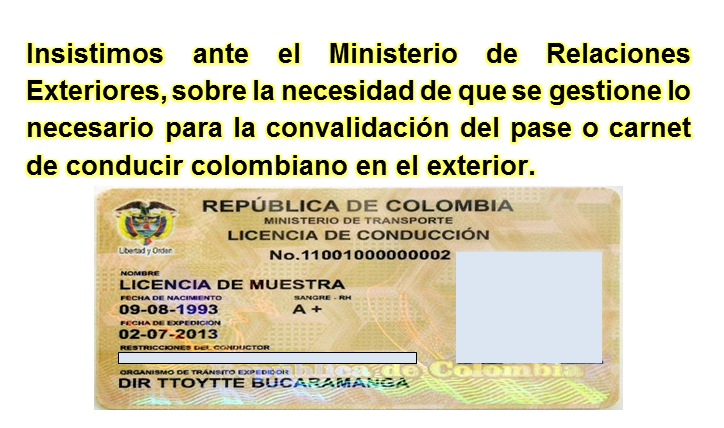 Actualmente en el exterior, salvo en España, cualquier colombiano que desee conducir un vehículo, bien sea particular o de servicio público, aunque posea el carnet (pase) de conducción colombiano, debe someterse a largos y dispendiosos exámenes, que aparte les son imposible de realizar debido a su elevado costo.
