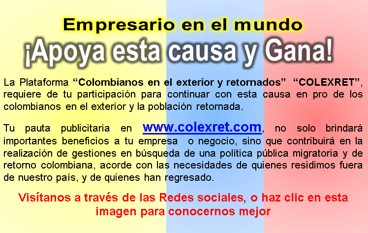 La Población retornada que se acoja a la Ley 1565 de 2012 (Ley retorno), y que cree empresa en Colombia tendrá durante determinado tiempo publicidad gratis a través de uat.colexret.com. Esta oferta se extiende a los emprendedores colombianos que a partir de la fecha creen empresa en el exterior y su plantilla de trabajadores de nacionalidad colombiana supere el 50%. Asi mismo estamos incluyendo gratis en un apartado especial, nombre y dirección a manera de “clasificado” de todas las empresas y negocios colombianos en el exterior.