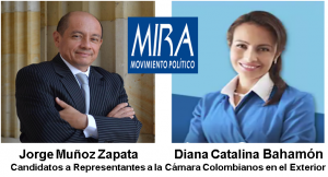 En cuanto al Partido político MIRA, tenemos a tres candidatos, del que uno de ellos, Jorge Muñoz Zapata, ya es “viejo” conocido, no solo por su obra social repartiendo comida en barrios marginados de Queens en EE.UU., sino porque durante dos (2) meses en la pasada legislatura ocupó temporalmente la curul de Representante a la Cámara por los colombianos en el exterior, en reemplazo de su compañera Ana Paola Agudelo, quien estuvo durante ese tiempo de baja por maternidad. Tanto a Jorge Muñoz, como a Diana Catalina Bahamón Morales quien es también candidata por esa lista, y que reside en España, les hemos enviado nuestro invitación y puesto a disposición esta página y nuestros espacios en las redes sociales, para que previa coordinación nos den a conocer detalladamente sus perfiles y propuestas electorales. A quien no hemos podido localizar, es al otro candidato por esa lista, Diego Enrique Riaño León.