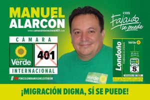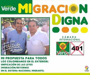 Quiero enviarles un saludo muy efusivo, también un fuerte abrazo a los Migrantes, Victimas y Refugiados en el mundo. Los invito a creer, que es posible tener una Migración Digna, hemos dado pasos muy importantes que nos permiten seguir luchando por los derechos humanos, a conocer nuestro trabajo, a profundizar en nuestras propuestas, también quiero recordarles que del 5 al 11 marzo podrán acercase a los diferentes consulados donde inscribieron sus cédulas a votar por nuestras propuestas, Cámara Internacional, partido Alianza Verde, marcando en el tarjetón el logo del partido Alianza Verde (el girasol) y el numero 401.