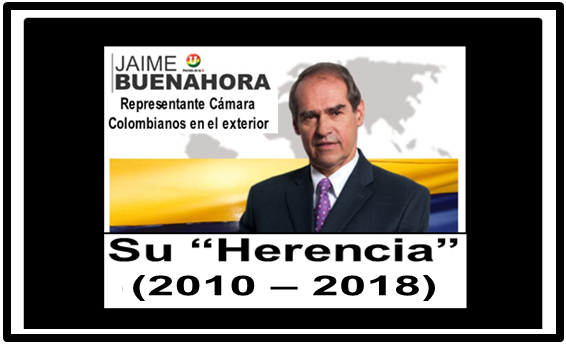 Aparte de lo anterior, al finalizar esta nota dejamos a nuestros lectores algunos links relacionados con artículos que en el pasado hemos publicado sobre las gestiones del Sr. Jaime Buenahora Febres, saliente Representante a la Cámara por los colombianos en el exterior, y quien gracias a los colombianos en el exterior devengó durante los últimos OCHO (8) AÑOS, mas de TRES MIL MILLONES (3.000´000.000) DE PESOS de salario y demás, por sus servicios, los cuales consistían en representar políticamente ante el Congreso a esa población, y buscarle soluciones a sus necesidades, y de la lectura de este artículo deducimos que sí las buscó pero NUNCA las encontró. Y algunas muy mínimas que realizó, luego de suplirse de ellas las destruyó, como en el caso de la Segunda Curul en la Cámara de Representantes; y la Ley 1565 de 2012 (Ley retorno), que logró sacar a flote pero mas del 90% está inoperante, pues nunca se preocupó por hacerle seguimiento a su ejecución y mucho menos a utilizar su poder político para que se asignara más presupuesto para el real desarrollo de ésta en beneficio de la población retornada que a ella se ha acogido.
