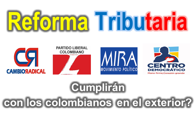 La nueva “Reforma Tributaria” será una oportunidad para que los Partidos políticos “Cambio Radical”, “Liberal”, “Centro Democrático”, “MIRA”, y subsidiariamente el Conservador y el P. de la U, le cumplan a los ciudadanos que creyeron en ellos y los eligieron para llevar las riendas de nuestro país en los siguientes CUATRO (4) AÑOS; uno de ellos por estar al frente de la Presidencia (C. Democrático), y los otros por haber coadyuvado electoralmente en la consecución de ese objetivo. Igualmente será una gran oportunidad para los demás partidos, especialmente “Alianza Verde”, “Colombia Humana”, “Polo Democrático”, y “Compromiso Ciudadano” en demostración de su incondicional apoyo a sus connacionales en el exterior, En el caso de Alianza Verde y Polo Democrático habrán podido ver como en las últimas elecciones ha ido en aumento el apoyo de los colombianos en el exterior a sus aspiraciones políticas, y eso sin haberles dado nada. Imagínense si les dan algo!!!!.