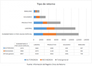 Las solicitudes de retorno tramitadas se concentraron en los tipos de retorno humanitario con un 34% (5957) y laboral con un 32% (5539).