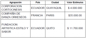 Ya en cuanto al apoyo brindado por el Ministerio de Cultura desde el año 2011, a Organizaciones nacionales o internacionales, al igual que a ciudadanos del común para la realización de eventos culturales fuera de nuestro país, nos dijo esa Cartera que: