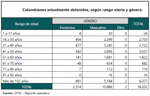 Hasta el 03 de Diciembre de 2018, en el exterior habían 18.202 colombianos detenidos, de los cuales 2.314 son mujeres y 15.886 hombres, en más de 60 países alrededor del mundo.