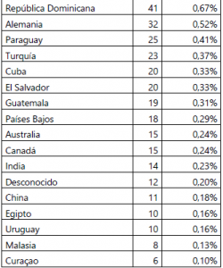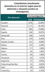 Vemos que en Ecuador, Panamá, Chile, España, Venezuela, Perú y EE.UU, se concentra más del 80% de los colombianos detenidos en el mundo.