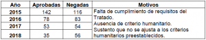 Al preguntarle al Ministerio de Relaciones Exteriores sobre el número de solicitudes de repatriación que se han efectuado desde el año 2015 a terminar el 2018, por parte del Estado colombiano, las resueltas favorablemente, y cuántas negadas y sus motivos, lo mismo que las que se encuentren pendientes de resolución, nos envía el siguiente cuadro estadístico, agregando que ese estudio lo realiza la Comisión Intersectorial para el Estudio de las Solicitudes de Repatriación de Presos: